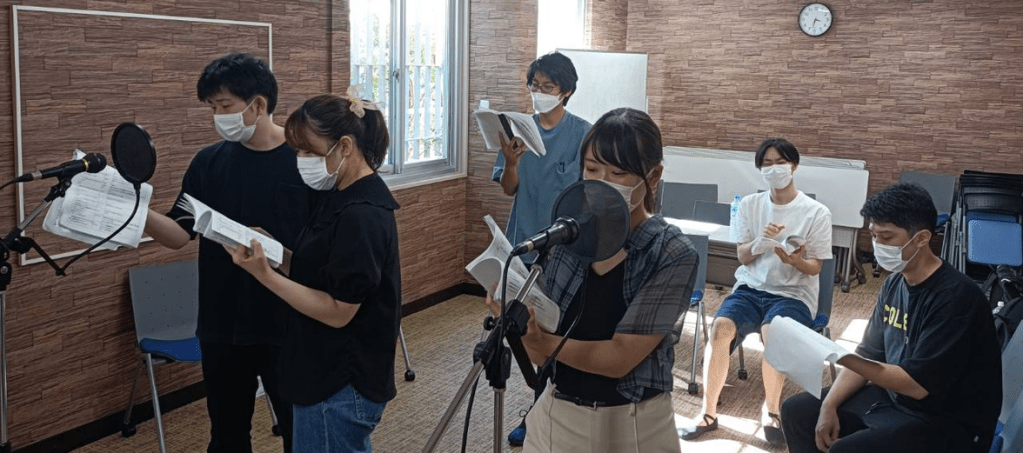 腹式呼吸・発声・滑舌・演技などの基礎訓練はもちろん、アフレコでのマイクワークで実技の練習も行います。